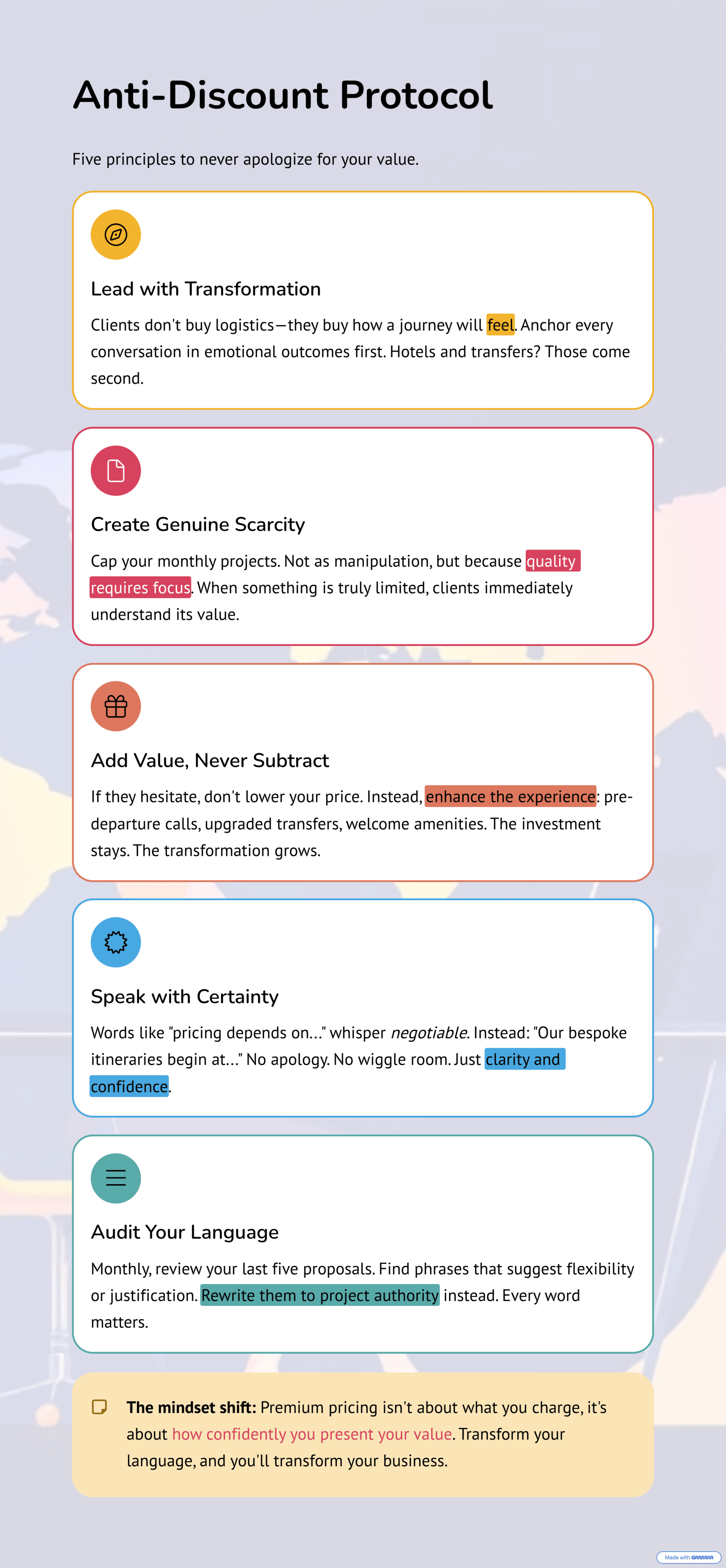 "Let me be completely transparent with you," she said. "I don't negotiate on price, and here's why: the care and personalization you've seen in this itinerary? That's what my pricing protects. If price is the primary factor, I completely understand, and I'm happy to recommend another advisor. But if you want someone who will advocate for you at every step, I'd love to move forward together."